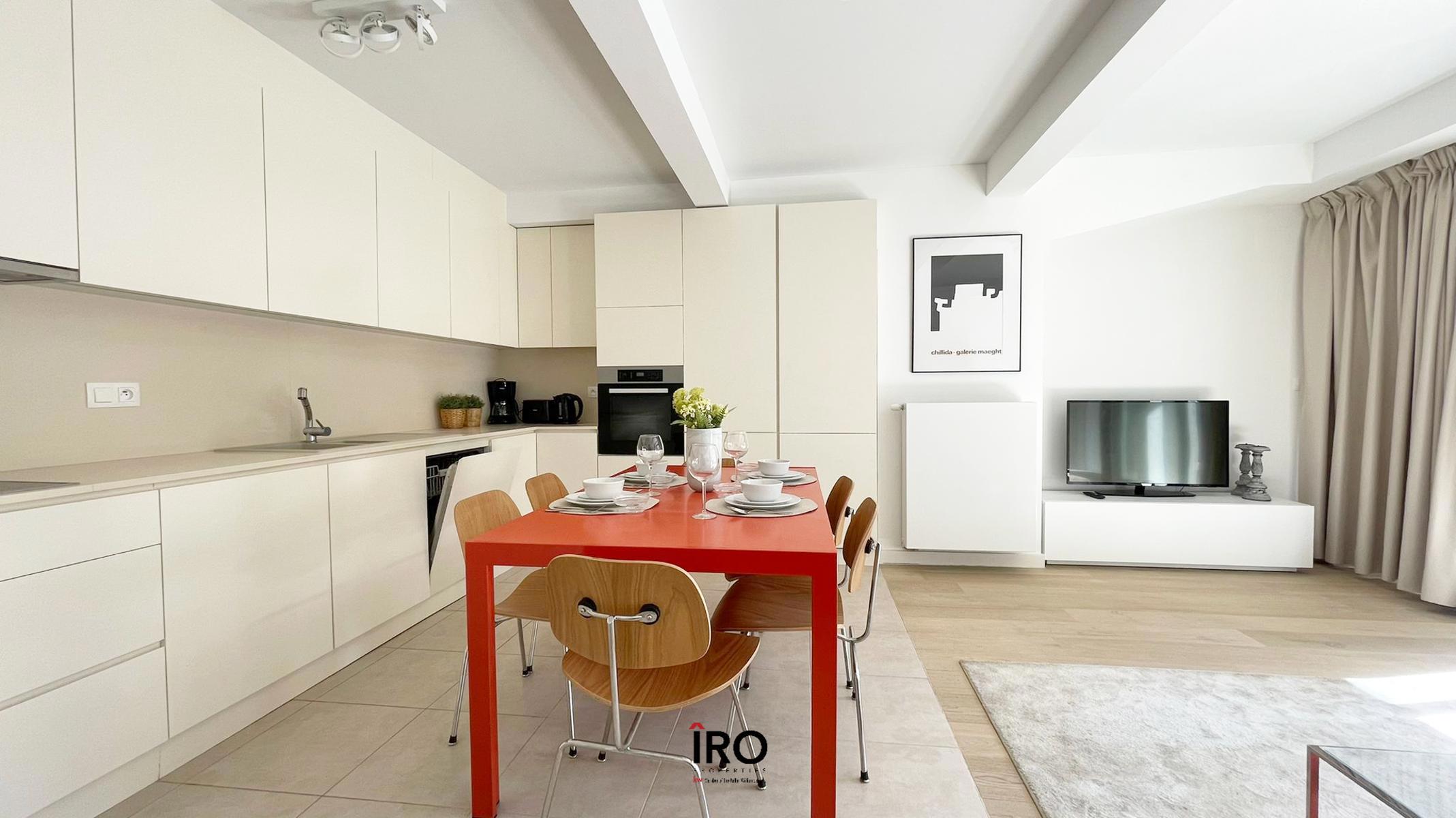 Entre Toison D’or et Place Stéphanie Bel appartement spacieux et lumineux meublé avec TERRASSE dans une surface habitable de +/- 85m², composé comme suit : un hall d’entrée, séjour très lumineux , cuisine hyper équipée, deux chambres avec dressing, une salle de douche, une salle de bain, WC séparé, une buanderie, un vestiaire, cave…+ provision de charges communes de 200€/mois (eau chaude, chauffage). Possibilité de louer un emplacement parking.***photos en attente*** PEB B. INFOS & VISITES : 0478711328. – Iroproperties.be